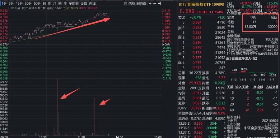 11月10日午后,沪指拉升翻红,食品饮料、美容护理、医药行业等板块强势。数据显示,医疗器械指数ETF(159898)目前涨1.75%,盘中获得净申购约1100万份,按实时净值计算约640万元。